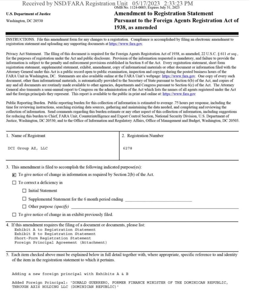 Según otras informaciones, el registro de la contratación de la firma de lobistas ante el Departamento de Justicia de los Estados Unidos fue realizado por Justin Peterson, en representación de DCI Group.