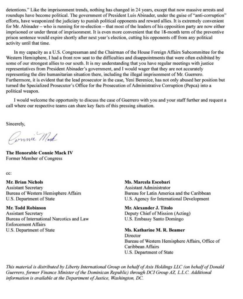 Una de las primeras acciones coordinadas por la firma de lobistas de Washington ha sido una comunicación dirigida al encargado de la embajada de los Estados Unidos en Santo Domingo, Isiah Parnell, suscrita por el ex congresista estadounidense Connie Mack. En dicha comunicación, a la que nuestro medio ha tenido acceso, Mack afirma que el gobierno del presidente Luis Abinader ha utilizado el poder judicial para castigar a los opositores políticos y beneficiar a sus aliados bajo el pretexto de luchar contra la corrupción.