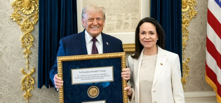 La dirigente opositora venezolana María Corina Machado entregó este jueves al presidente de Estados Unidos, Donald Trump, una medalla del Premio Nobel de la Paz colocada en un marco decorado, acompañada de un mensaje de agradecimiento del pueblo venezolano por...