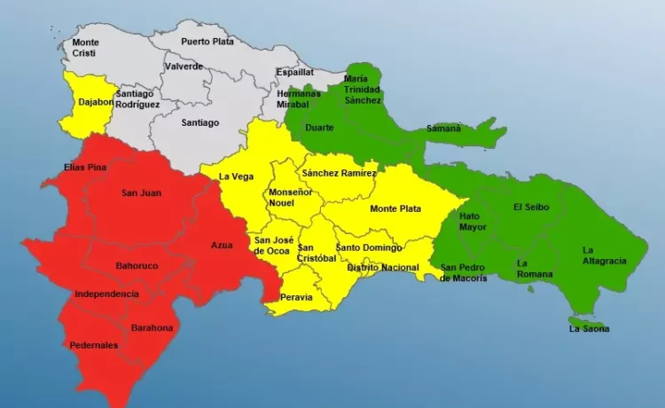 El más reciente boletín del COE detalla que las provincias en alerta roja son: Pedernales, Barahona, Elías Piña, Independencia, San Juan, Azua y Bahoruco. En alerta amarilla se encuentra: Santo Domingo, Distrito Nacional, Peravia, Dajabón, La Vega, Monseñor Nouel, San José de Ocoa, San Cristóbal, Sánchez Ramírez y Monte Plata.