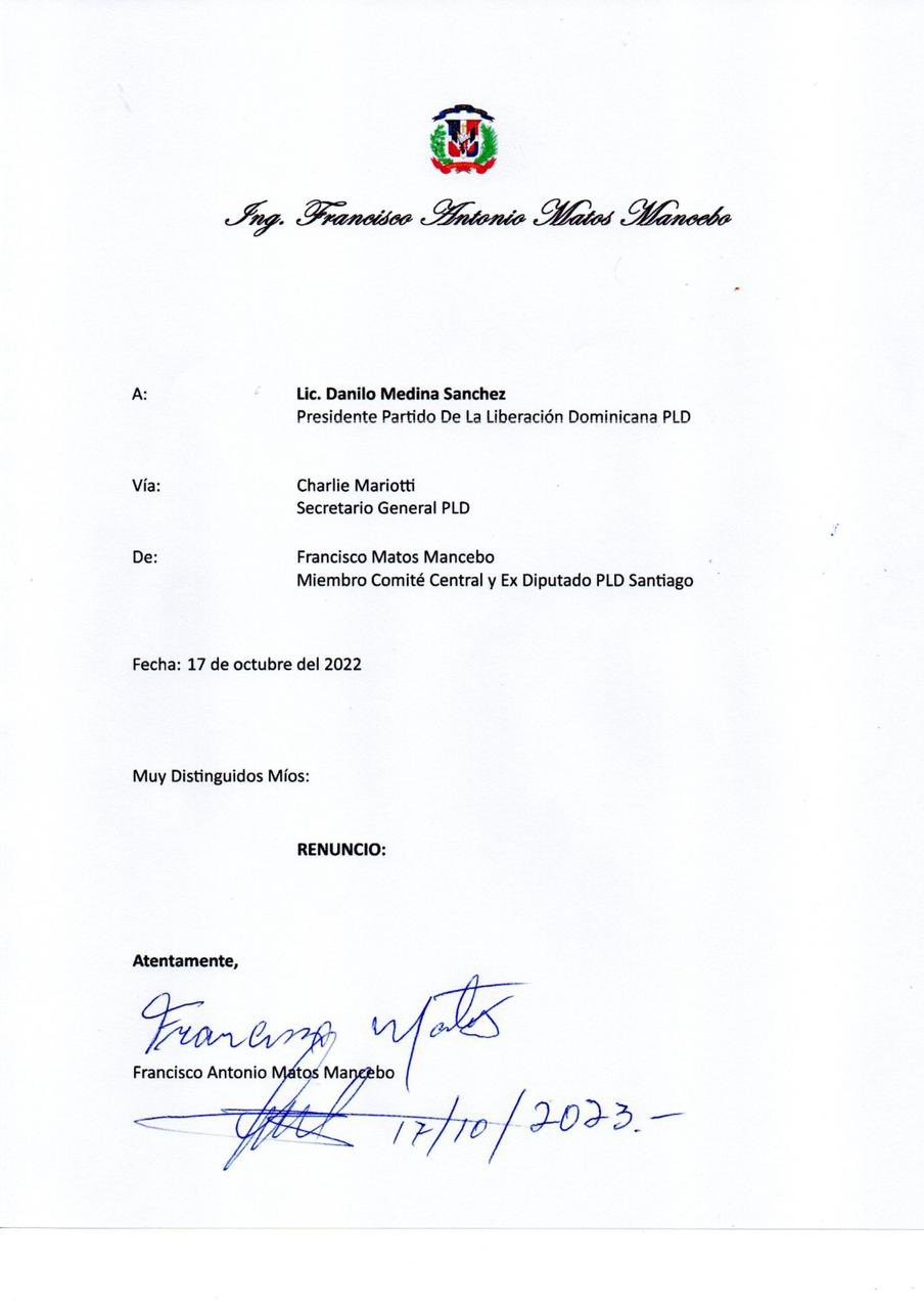 En una carta enviada al presidente y al secretario general del PLD, el expresidente Danilo Medina y Charlie Mariotti, solo se limitó a decir “renuncio”.