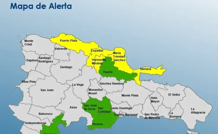 La entidad informó que por los aguaceros; Espaillat, Puerto Plata, María Trinidad Sánchez, Hermanas Mirabal y Samaná, se encuentran en alerta amarilla. Mientras que Barahona, Duarte, sobre todo el Bajo Yuna, San José de Ocoa, San Cristóbal y Peravia, están en verde.