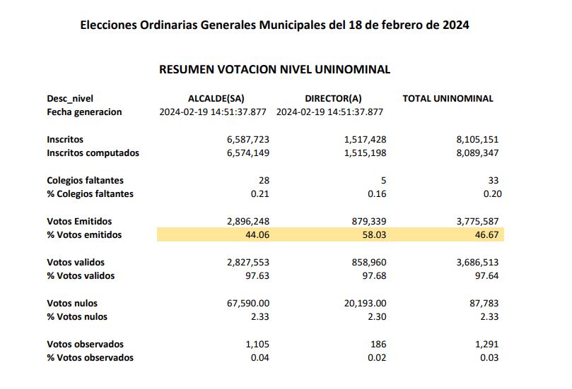 SANTO DOMINGO.- La Junta Central Electoral (JCE) presentó los datos preliminares de la votación en el nivel uninominal de las elecciones municipales de este domingo 18 de febrero, en los que se revelan abstención récord de 53.33% a nivel general.