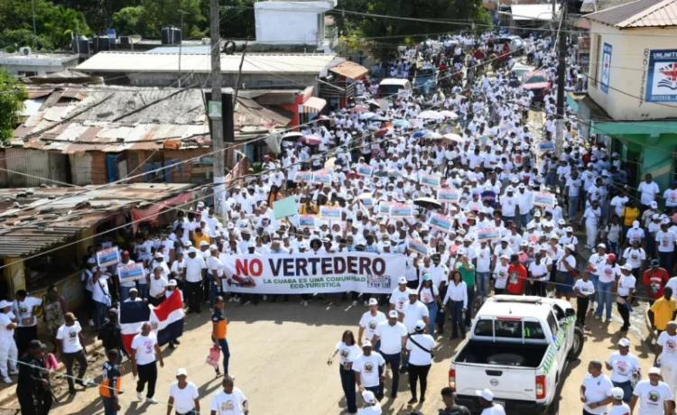 Bajo un sol intenso y vestidas de blanco, decenas de personas salieron ayer a la avenida principal de La Cuaba, en Pedro Brand, para manifestarse contra la instalación de un relleno sanitario en el paraje El Aguacate. Con consignas como “No al vertedero” y “Mátennos con balas y no con basura”, los comunitarios expresaron su temor de que el proyecto afecte su salud, los recursos naturales y el desarrollo ecoturístico de la zona.