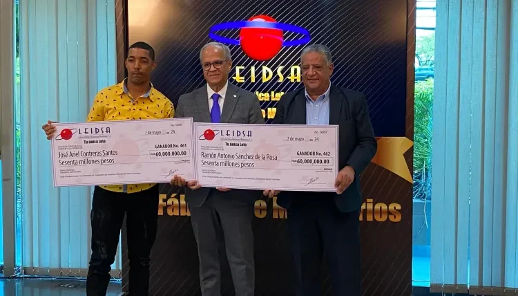 La Lotería Electrónica Internacional Dominicana (Leidsa) informó este martes que el joven José Ariel Contreras Santos y Ramón Ant. Sánchez de La Rosa, recibieron sus respectivos cheques de RD$60 millones cada uno, proporción que le corresponde por haber resultado ganadores de los RD$120 millones de pesos que tenía el acumulado el Loto, en el sorteo del pasado sábado 6 de abril.