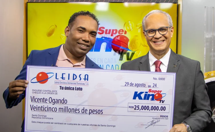 SANTO DOMINGO.- La Lotería Electrónica Internacional Dominicana, S.A (LEIDSA), informó que Vicente Ogando recibió el cheque de 25 millones de pesos, ya que resultó ganador con el Súper Kino Tv, en el sorteo correspondiente al pasado jueves 8 de agosto.
