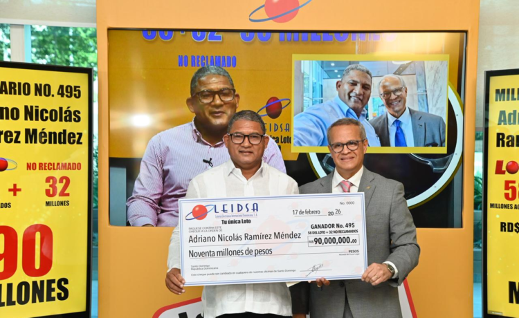 La Lotería Electrónica Internacional Dominicana, S.A (Leidsa) informó este martes que el señor Adriano Nicolás Ramírez Méndez, recibió el cheque de 90 millones de pesos, monto que tenía el sorteo Loto del pasado sábado 24 de enero.