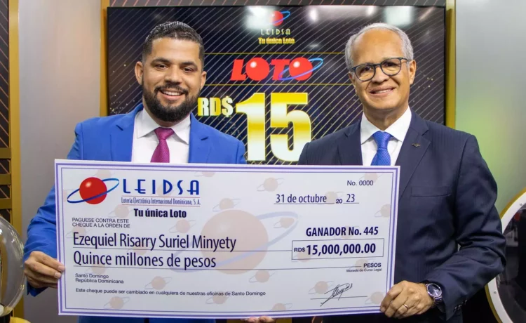 La Lotería Electrónica Internacional Dominicana (Leidsa) informó que Ezequiel Suriel Minyety, recibió el cheque de 15 millones de pesos, proporción que le corresponde por haber dividido el premio de los 30 millones de pesos que tenía acumulado el sorteo Loto del pasado sábado 16 de septiembre. Ambos ganadores acertaron con los números: 1-9-18-28-36-38.