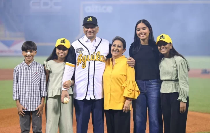 Incentivado por la presencia de cuatro de sus nietos, que le hicieron marco en el montículo, el doctor Leonardo Aguilera realizó el lanzamiento de la primera bola para dejar inaugurado el campeonato de béisbol otoño-invernal 2025-2026, en el Estadio Cibao, donde las Águilas Cibaeñas recibieron a los Gigantes del Cibao.