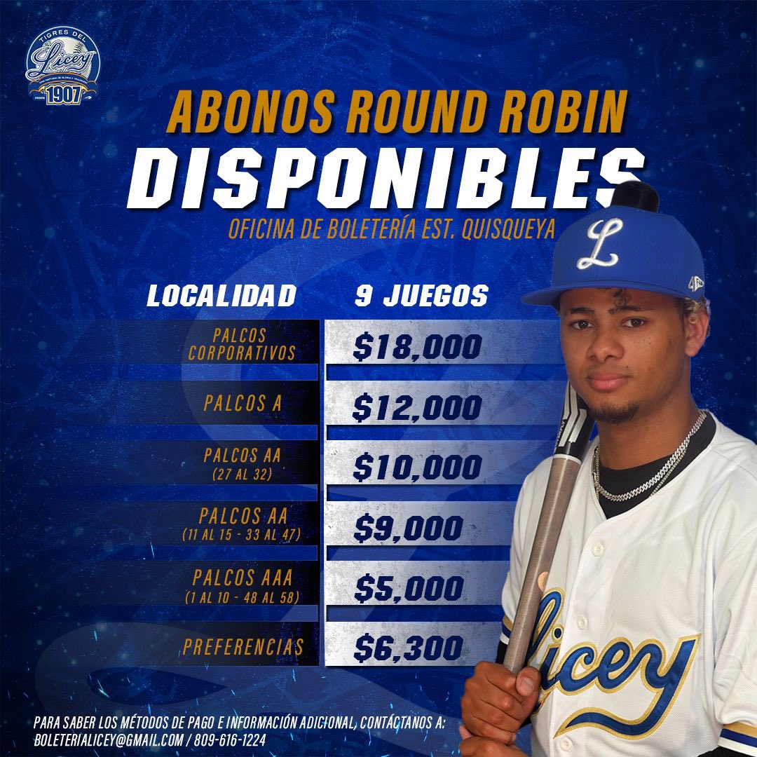 Los interesados en conocer los métodos de pago de los abonos para el round robin e información adicional pueden escribir al correo electrónico boleterialicey@gmail.com o marcar el número telefónico 809-616-1224.