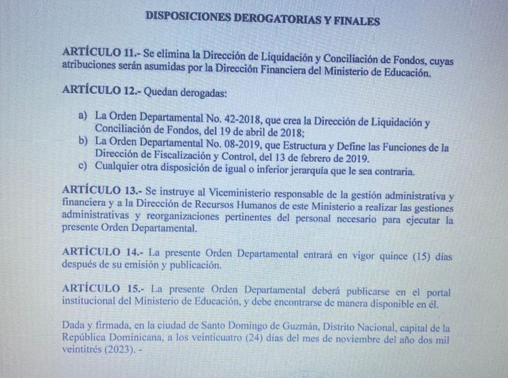 El Ministerio de Educación eliminó la Dirección de Liquidación y Conciliación de Fondos, cuyas atribuciones serán asumidas por la Dirección Financiera de esa misma entidad.