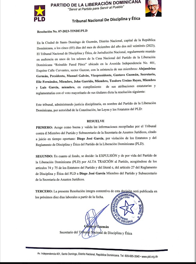 El Partido de la Liberación Dominicana (PLD) expulsó de sus filas al candidato del Colegio de Abogados, Diego José García por alta traición, luego de la controversia que ha generado sus declaraciones de que Yohan López ganó la presidencia del Colegio de Abogados de la República Dominicana (CARD).