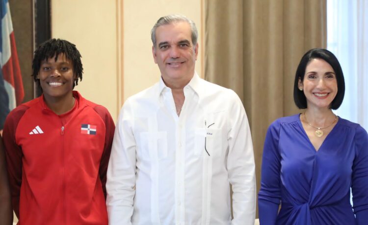 El presidente Luis Abinader, junto con la primera dama Raquel Arbaje, recibió la tarde de este viernes en su Despacho Presidencial a la campeona del mundo en los 400 metros planos de atletismo, Marileidy Paulino.