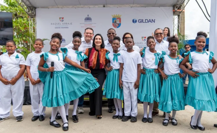 La primera dama, Raquel Arbaje; el ministro de Industria, Comercio y Mipymes (MICM), Yayo Sanz Lovatón, y Arquímedes George, vicepresidente y gerente país de Gildan República Dominicana, entregaron un parque infantil nuevo y un campo de béisbol remozado en la comunidad de Bella Vista, municipio San Antonio de Guerra, en la provincia Santo Domingo.