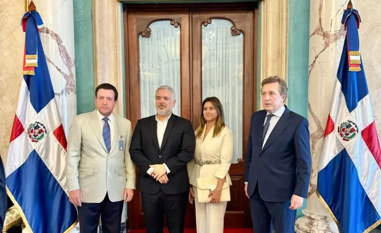 Javier Cremades, presidente de la World Jurist Association; Iván Duque, expresidente de Colombia y presidente del Comité Internacional del World Law Congress; el José Alejandro Aybar M., canciller de UNICARIBE y presidente del Comité Ejecutivo de la World Law Congress, así como Jorge Luis Polanco sostuvieron una reunión con el presidente Luis Abinader en el Palacio Nacional donde conversaron sobre los detalles del evento.