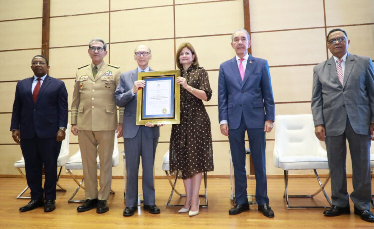 Peña destacó la extraordinaria trayectoria en el ámbito científico del historiador Frank Moya Pons a quien le fue entregado el máximo galardón de “Investigador de la Nación” y señaló que es un testimonio del poder del intelecto y del compromiso inquebrantable con la verdad y el progreso.