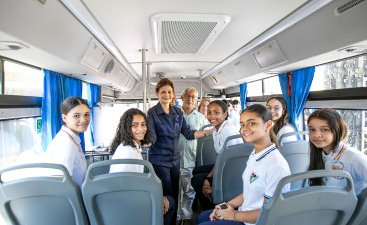 Santiago.- Desde uno de los 150 autobuses escolares que se entregaron formalmente este domingo en Santiago, la vicepresidenta de la República, Raquel Peña, dejó en funcionamiento el Sistema Nacional de Transporte Estudiantil (TRAE) para Santiago.